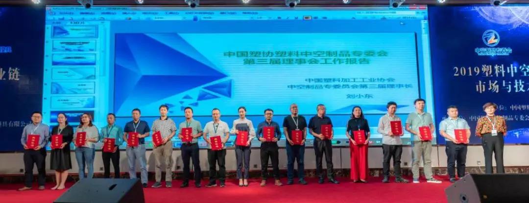 中國塑協(xié)領(lǐng)導(dǎo)為中空制品專委會(huì)第四屆理事會(huì)成員頒發(fā)銅牌。