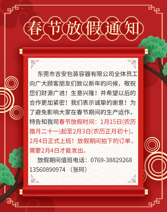 新春復(fù)始,萬象更新!非常感謝各位新老客戶長期以來對吉安容器的鼎力支持與關(guān)照,在新春來臨之際,東莞市吉安包裝容器有限公司全體員工向廣大顧客朋友們致以新年的問候,敬祝您們財源廣進!生意興隆!并希望以后的合作更加緊密!我們表示誠摯的謝意!