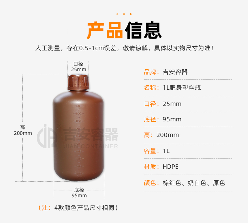 小口塑料瓶采用全新HDPE塑膠原料吹塑而成,具備韌性好、耐酸堿、耐腐蝕、不變形,密封性能佳等特點(diǎn),可根據(jù)客戶需求定制、改色、產(chǎn)品適用于化工、清洗劑、醫(yī)藥、液體、食品、農(nóng)業(yè)等各行業(yè)包裝。