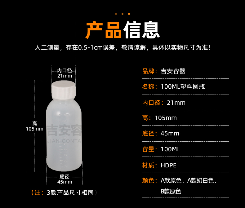 小口塑料瓶采用全新HDPE塑膠原料吹塑而成,具備韌性好、耐酸堿、耐腐蝕、不變形,密封性能佳等特點,可根據客戶需求定制、改色、產品適用于化工、清洗劑、醫(yī)藥、液體、食品、農業(yè)等各行業(yè)包裝。