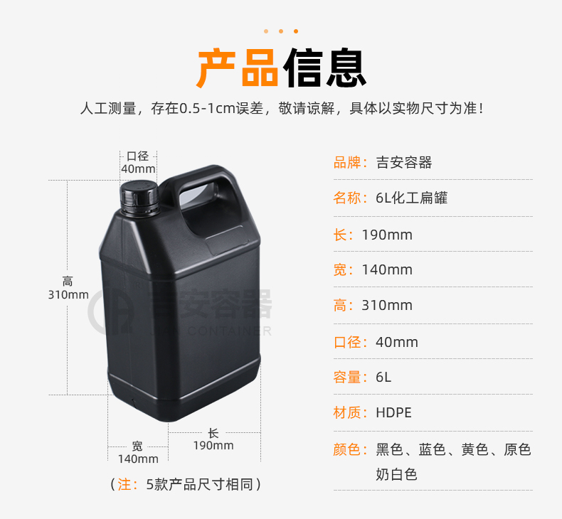 塑料扁罐采用HDPE原材料吹塑而成,具有良好的耐酸堿性及密封性,方形設(shè)計(jì)方便堆放,不占用空間,美觀實(shí)用。具備不變形,使用方便等特征,可根據(jù)客戶需求做印刷及貼膜,產(chǎn)品適用于尿素、機(jī)油、汽油、清洗劑、化工助劑、食品添加劑等液體包裝。