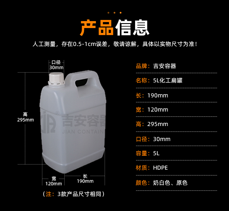 塑料扁罐采用HDPE原材料吹塑而成,具有良好的耐酸堿性及密封性,方形設(shè)計(jì)方便堆放,不占用空間,美觀(guān)實(shí)用。具備不變形,使用方便等特征,可根據(jù)客戶(hù)需求做印刷及貼膜,產(chǎn)品適用于尿素、機(jī)油、汽油、清洗劑、化工助劑、食品添加劑等液體包裝。