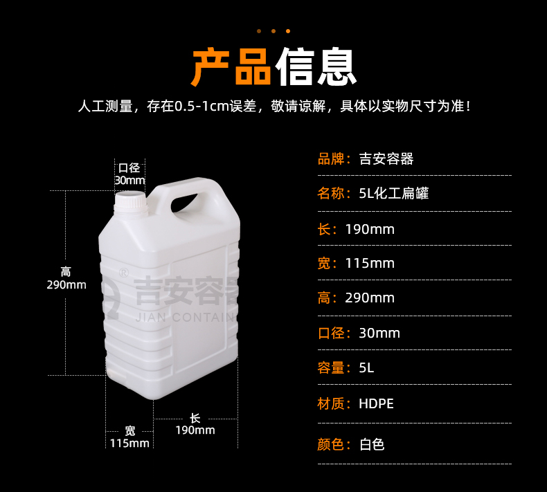 塑料扁罐采用HDPE原材料吹塑而成,具有良好的耐酸堿性及密封性,方形設(shè)計方便堆放,不占用空間,美觀實用。具備不變形,使用方便等特征,可根據(jù)客戶需求做印刷及貼膜,產(chǎn)品適用于尿素、機油、汽油、清洗劑、化工助劑、食品添加劑等液體包裝。