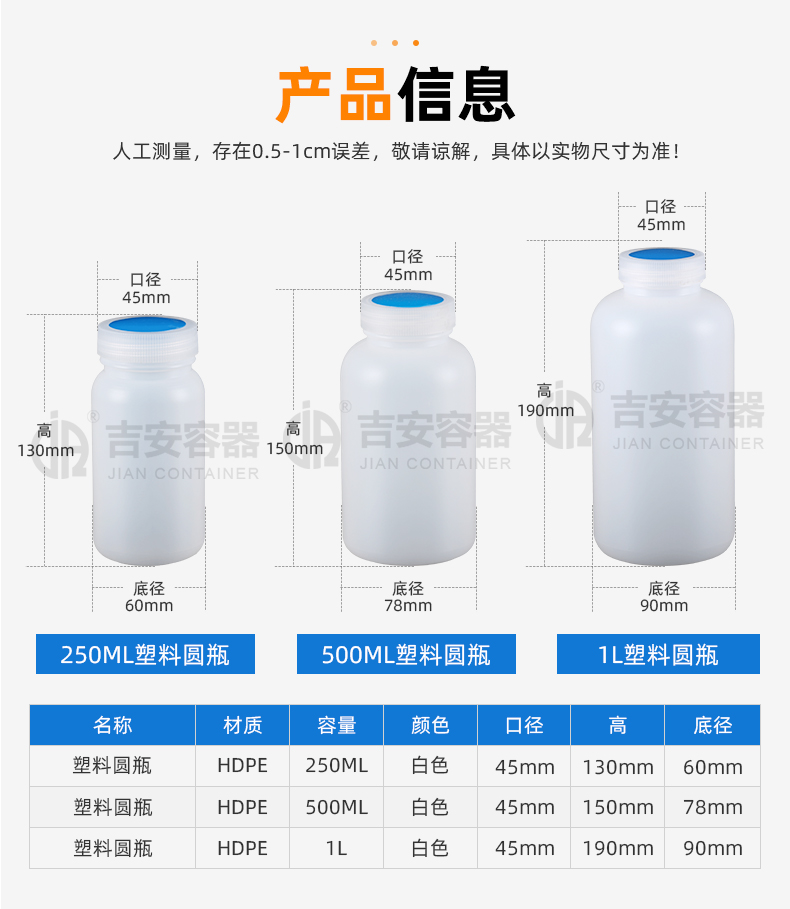 東莞市吉安包裝容器有限公司創(chuàng)立于2000年8月1日,是中國知名品牌企業(yè)。已通過ISO 9001質(zhì)量管理體系資質(zhì)認(rèn)證,加入了中國中空協(xié)會(huì),并獲得《中國知名品牌》,《國家標(biāo)準(zhǔn)合格產(chǎn)品》,《全國重合同守信用AAA級(jí)企業(yè)》,《質(zhì)量.服務(wù).誠信AAA企業(yè)》等榮譽(yù)稱號(hào)。根據(jù)材質(zhì)的不同,我們的產(chǎn)品分為塑料容器、鐵質(zhì)容器、鋁材容器、玻璃容器、紙質(zhì)容器等五大類。按產(chǎn)品的名稱分為塑料桶、塑料瓶、包裝桶、涂料桶、機(jī)油桶、油脂桶、化工罐、膠水瓶、鐵桶、鐵罐、鋁瓶、鋁罐、阻隔瓶、高阻隔瓶等,容量從3ML至1000L多種規(guī)格,多種款式。適合包裝的產(chǎn)品包括:化學(xué)試劑、化工原料、化工助劑、飼料添加劑、油墨、油漆、樹脂農(nóng)藥、日用化學(xué)品、聚氨脂、膠粘劑,廣泛應(yīng)用于化工、建筑、食品、醫(yī)療、生物等各領(lǐng)域。