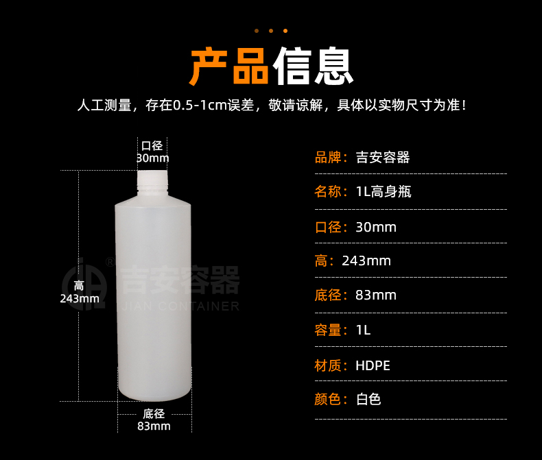 小口塑料瓶采用全新HDPE塑膠原料吹塑而成,具備韌性好、耐酸堿、耐腐蝕、不變形,密封性能佳等特點(diǎn),可根據(jù)客戶需求定制、改色、產(chǎn)品適用于化工、清洗劑、醫(yī)藥、液體、食品、農(nóng)業(yè)等各行業(yè)包裝。