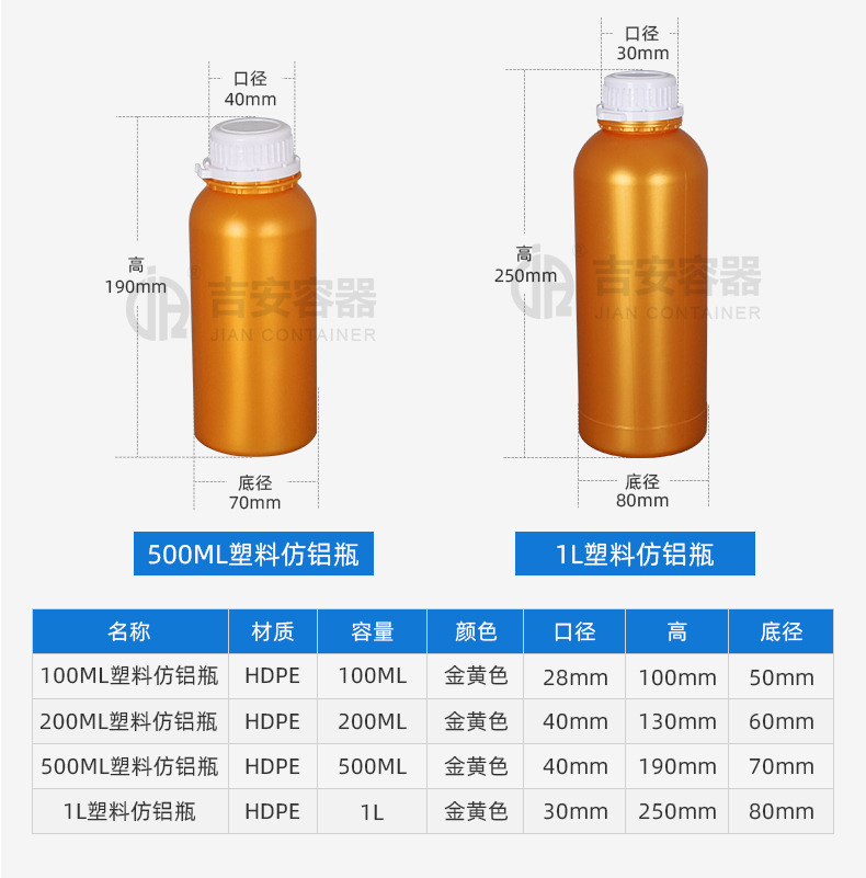東莞市吉安包裝容器有限公司創(chuàng)立于2000年8月1日,是中國知名品牌企業(yè)。已通過ISO 9001質(zhì)量管理體系資質(zhì)認(rèn)證,加入了中國中空協(xié)會,并獲得《中國知名品牌》,《國家標(biāo)準(zhǔn)合格產(chǎn)品》,《全國重合同守信用AAA級企業(yè)》,《質(zhì)量.服務(wù).誠信AAA企業(yè)》等榮譽稱號。根據(jù)材質(zhì)的不同,我們的產(chǎn)品分為塑料容器、鐵質(zhì)容器、鋁材容器、玻璃容器、紙質(zhì)容器等五大類。按產(chǎn)品的名稱分為塑料桶、塑料瓶、包裝桶、涂料桶、機油桶、油脂桶、化工罐、膠水瓶、鐵桶、鐵罐、鋁瓶、鋁罐、阻隔瓶、高阻隔瓶等,容量從3ML至1000L多種規(guī)格,多種款式。適合包裝的產(chǎn)品包括:化學(xué)試劑、化工原料、化工助劑、飼料添加劑、油墨、油漆、樹脂農(nóng)藥、日用化學(xué)品、聚氨脂、膠粘劑,廣泛應(yīng)用于化工、建筑、食品、醫(yī)療、生物等各領(lǐng)域。
